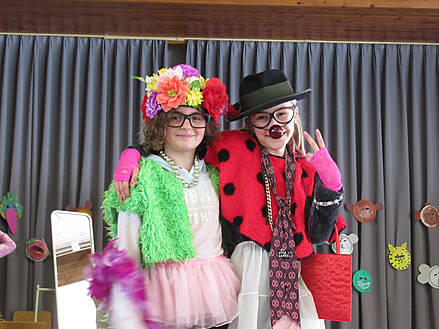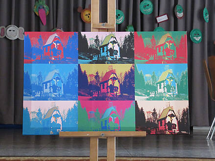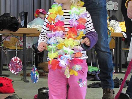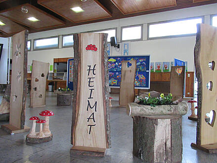 Lupfer mit Holzdekorationen, die neben den bunten Schüler-Arbeiten gut zur