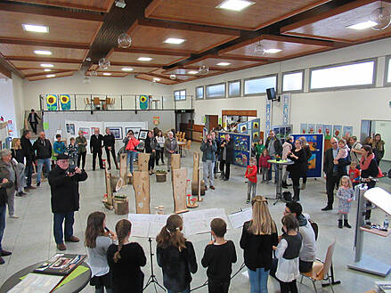 Die große „KiD- Kunst im Dorf“ – Ausstellung wurde am Samstag von den Flötenkids um Michaela Rohkohl musikalisch eröffnet. Bürgermeister Henry Heller bedankte sich bei den Hofstetter Hobbykünstlern, die mit ihrer kreativen Vielfalt das Dorf bereichern. Für Organisatorin Christine Störr und Michaela Rohkohl gab es Blumen und ein großes „Dankeschön“, für die Gäste anschließend ein kleines Konzert von Hannah und Helen Neumaier. Mit Gitarre und Gesang begeisterten die jungen Frauen ihr großes Publikum.