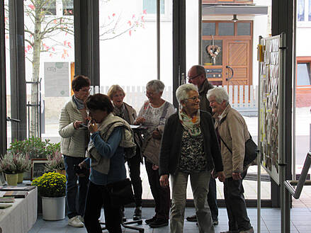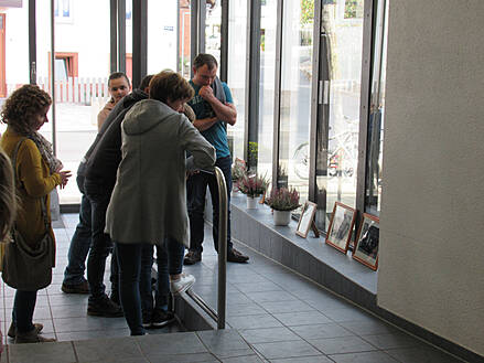 Galerie“, vor der Gemeindehalle und schließlich in der Halle selbst aufgestellt
